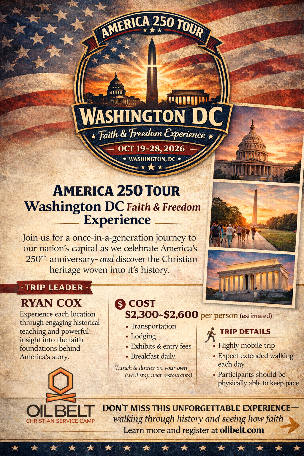 Join Ryan Cox and Oil Belt as we take a 10 day / 9 night tour to Washington D.C. to celebrate America's 250th year! We will visit important US historical sites as Ryan teaches the Christian Faith woven throughout it.